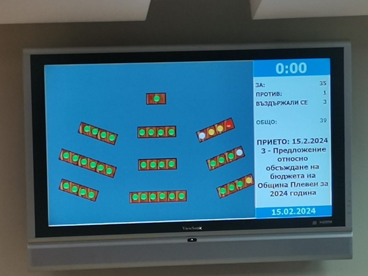 На 16 февруари 2024 г., Общински съвет – Плевен гласува бюджета на Общината за 2024 година. След оживени петчасови дебати, кратки почивки на искане от общински съветници и продължително заседание, бюджетът бе приет с 35 гласа „за“, 1 „против“ и 3 „въздържал се“. Бюджетният проект бе обсъден в детайли на заседания на десетте постоянни комисии преди това. В хода на сесията бяха направени гласувания по 16 предложения за изменения, от които 13 бяха приети.