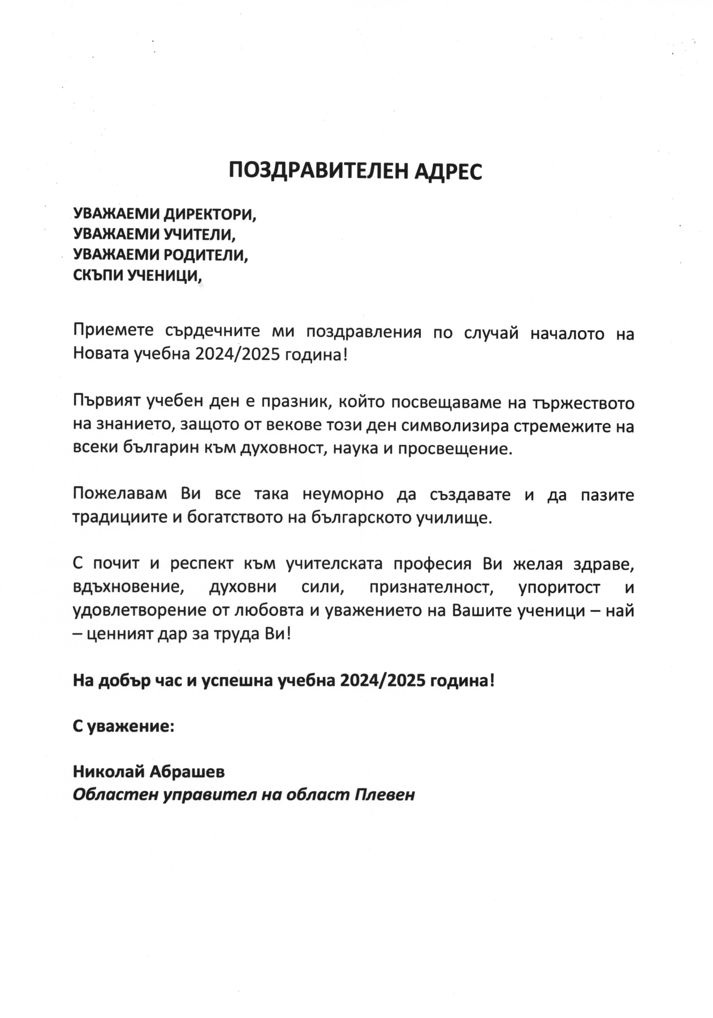 Приемете сърдечните ми поздравления по случай началото на Новата учебна 2024/2025 година!