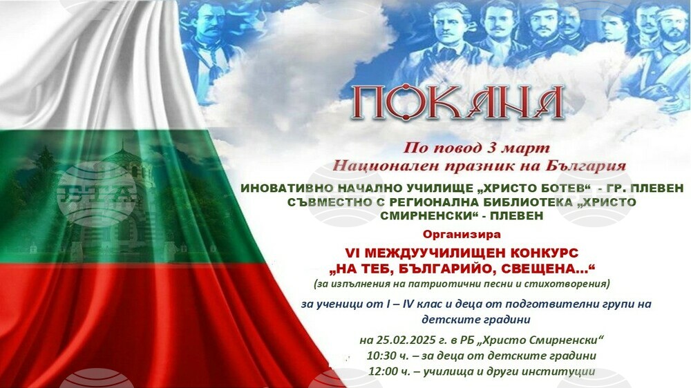 В Плевен предстои шестото издание на междуучилищния конкурс „На теб, Българийо, свещена…“, който акцентира върху изпълнението на патриотични песни и стихотворения. Събитието е организирано в чест на националния празник на България – 3 март, информира Цветелин Горанов, директор на Начално училище „Христо Ботев“ в Плевен. Училището работи в партньорство с Регионална библиотека „Христо Смирненски“ за реализацията на конкурса.