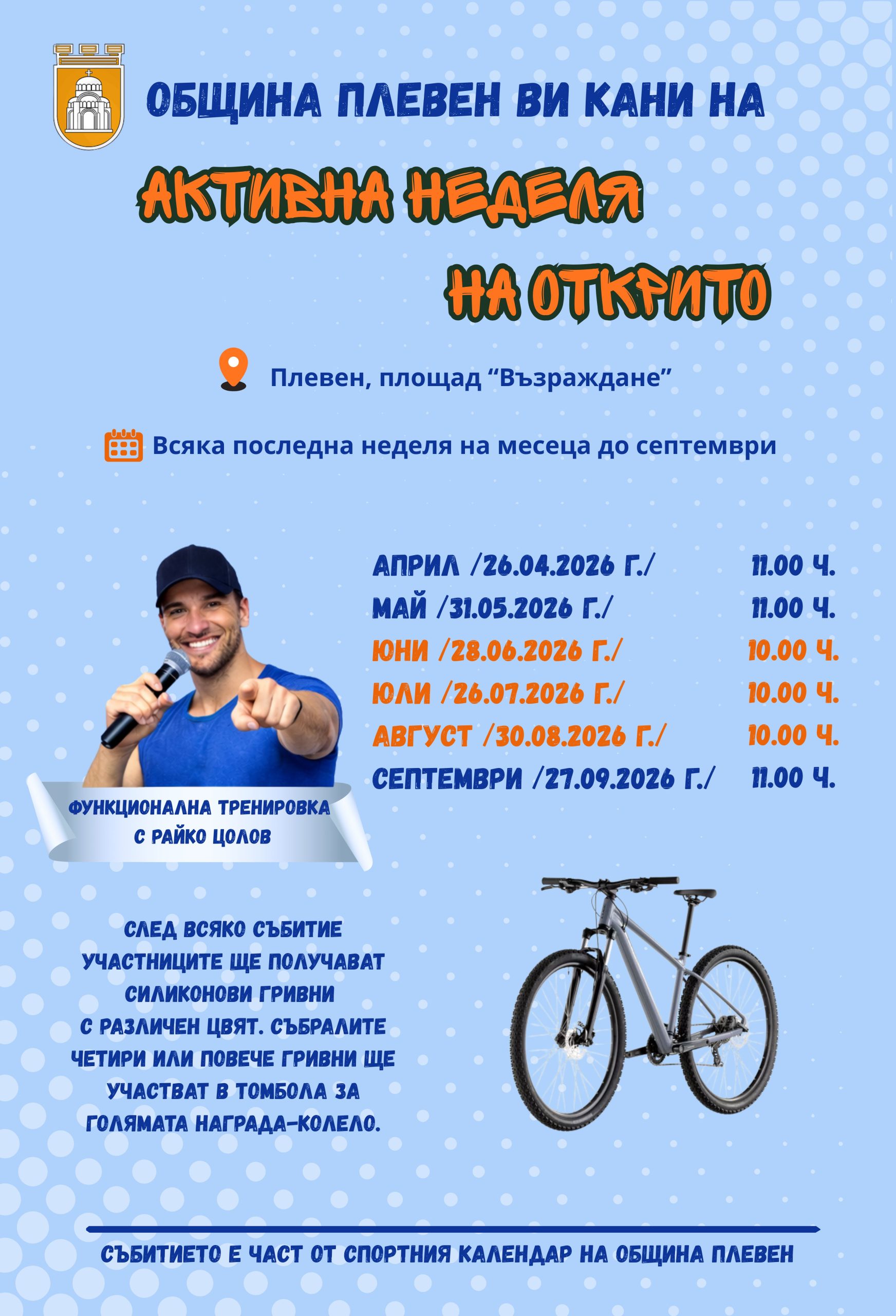 На заключителното събитие на 27.09.2026 г. всички, които са събрали поне четири гривни, ще бъдат включени в томбола за голямата награда – колело. Водещ на инициативата ще бъде Райко Цолов, посочен като активна фигура в Плевен.