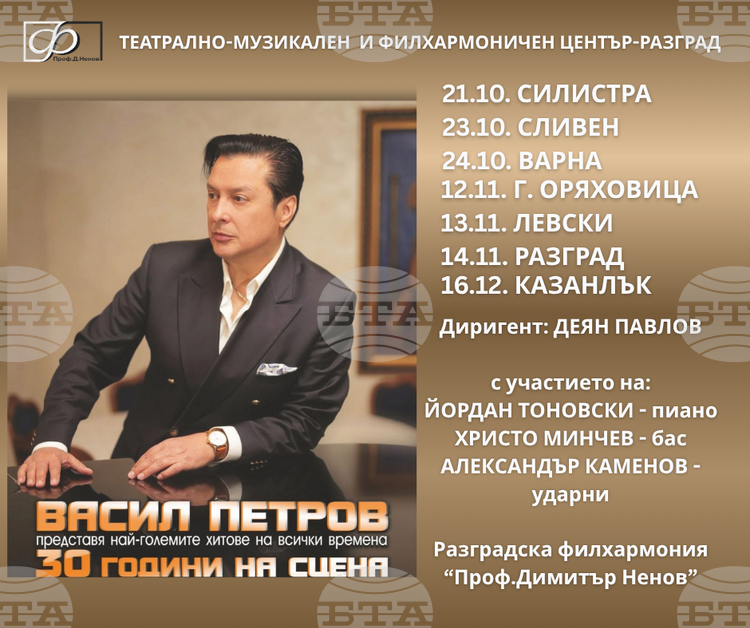 Васил Петров стартира нова концертна програма и ще обиколи страната заедно с Разградската филхармония „Проф. Димитър Ненов“ под диригентството на маестро Деян Павлов, съобщават от екипа на изпълнителя. В рамките на инициативата, наречена „30 години на сцена“, Петров ще изпълнява симфонични версии на емблематични песни и вечни класики. Сред тях са хитове на The Beatles, Франк Синатра, Kiss, както и композиции на Антонио Карлос Жобим, Франсис Лей и Франки Вали. Програмата включва и латино теми, както и мелодии от емблематични филми като тези на Чарли Чаплин, „Мисия невъзможна“, „Карибски пирати“, „Властелинът на пръстените“ и „Междузвездни войни“. Специално място заема и песента му „Другият“, адаптирана в нова симфонична версия.