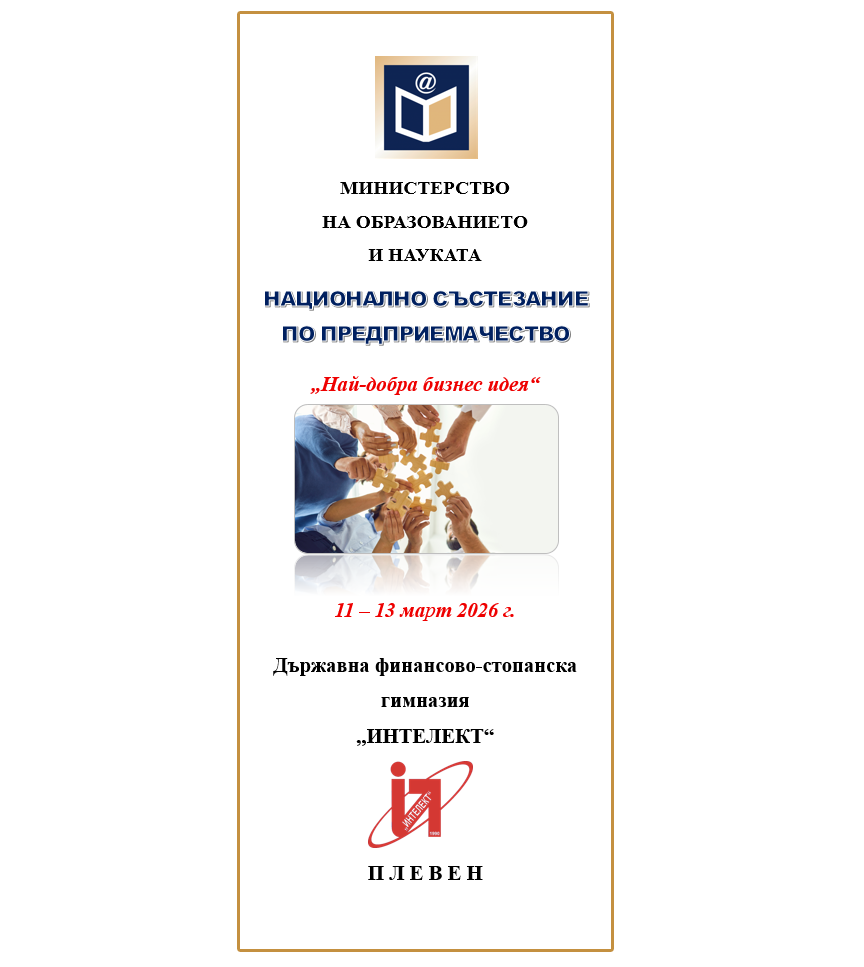 От 11 до 13 март 2026 г. в ДФСГ „Интелект“ ще се проведе Националното състезание по предприемачество „Най-добрата бизнес идея“. Инициативата ще събере участници, които ще представят и защитят свои бизнес концепции в рамките на тридневна програма, посветена на иновациите и предприемаческото мислене. Очаква се събитието да предостави възможност за обмен на идеи и опит, както и за оценяване на най-перспективните предложения.