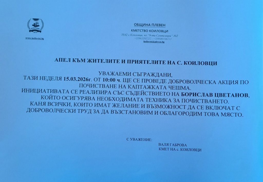 Жителите и приятелите на плевенското село Коиловци са поканени да се включат в доброволческа инициатива за почистване и облагородяване на каптажната чешма в населеното място. Акцията ще се проведе на 15 март 2026 г. (неделя) от 10:00 часа.