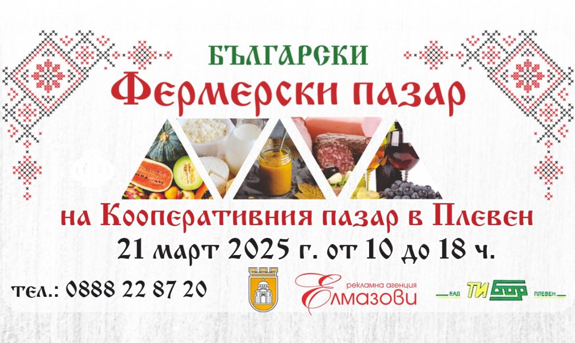 Фермерският пазар в Плевен ще има своето мартенско издание този петък, 21 март, от 10.00 до 18.00 часа, в района на Кооперативния пазар. Събитието, превърнало се в традиция, очаква плевенчани и гостите на града с богат асортимент от родни продукти.
