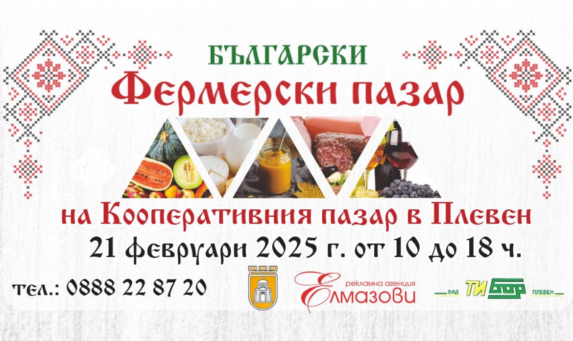 Февруарското издание на Фермерския пазар в Плевен се провежда днес, 21 февруари, на Кооперативния пазар в града, предлагайки разнообразие от продукти за посетителите си, въпреки ниските температури. Работното време на пазара е от 10.00 до 18.00 часа, като фермери и земеделски производители от страната представят своите стоки на жителите и гостите на Плевен.