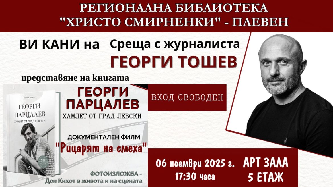 Журналистът Георги Тошев ще представи в Плевен своите книга и филм, посветени на легендарния актьор Георги Парцалев. Събитието, организирано от Регионална библиотека „Христо Смирненски“ в Плевен, ще се състои на 6 ноември, четвъртък, от 17.30 часа в арт залата на петия етаж на библиотеката. Входът за всички посетители ще бъде свободен.