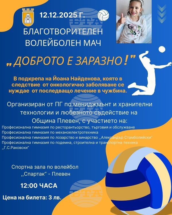 Община Плевен също подкрепя мероприятието, като предоставя залата в спортния комплекс „Спартак” за провеждане на турнира, който ще се състои на 12 декември (петък) под мотото „Доброто е заразно!”. Входът ще бъде три лева, като на място ще бъдат поставени кутии за допълнителни дарения.