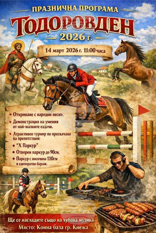 На 14 март в конната база в Кнежа ще се проведе турнир по прескачане на препятствия, съчетан с демонстрации на млади ездачи. Организатори са Община Кнежа и Клубът по конен спорт „Мизия“, а стартът е насрочен за 11:00 часа.