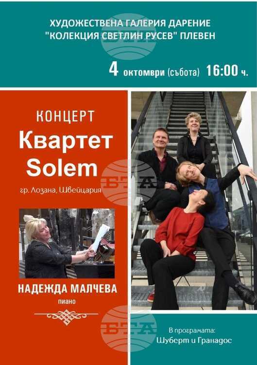 Квартет Solem, заедно с пианистката Надежда Малчева, ще се представят с камерен концерт в Плевен. Музикалното събитие е насрочено за утре, 4 октомври, и ще се проведе в Художествената галерия Дарение „Колекция Светлин Русев“, според информация предоставена от организаторите.