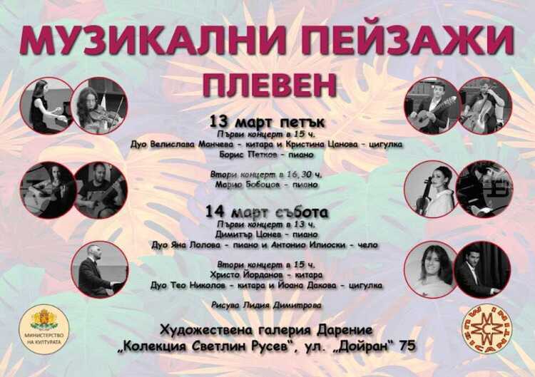 Сдружение „Музикантини“ представя в залата на Художествена галерия Дарение „Колекция Светлин Русев“ в Плевен иновативния си проект в две части „Музикални пейзажи“, в който изпълнения на млади български музиканти се съчетават с живописното изкуство на художничката Лидия Димитрова, съобщават от организацията.