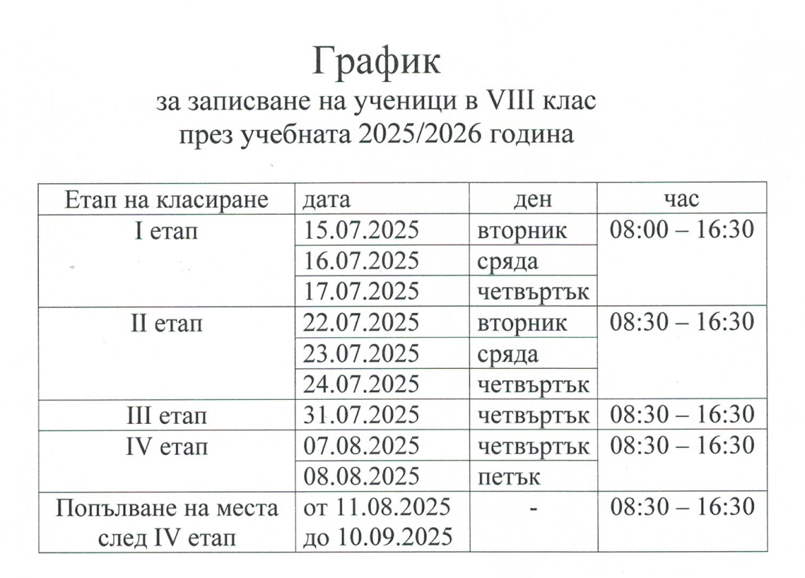 Министерството на образованието представи датите и процедурата за записване на ученици в VIII клас за учебната 2025/2026 година. Родителите и учениците могат да се информират за ключовите срокове и изисквания, свързани с приема. Целта е да се осигури плавен и организиран процес, който да улесни както учебните заведения, така и семействата в тази важна стъпка от образователната кариера на подрастващите. Допълнителни подробности и официалните документи ще бъдат достъпни на онлайн платформата на министерството.