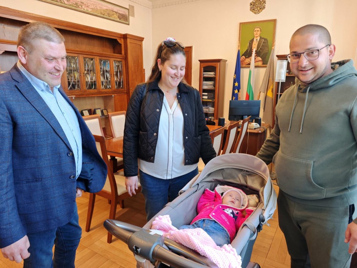 Дни преди посрещането на Първа пролет първото бебе на Плевен за 2026 година – Евелин, гостува заедно със семейството си в Община Плевен, където се срещна с кмета д-р Валентин Христов.
