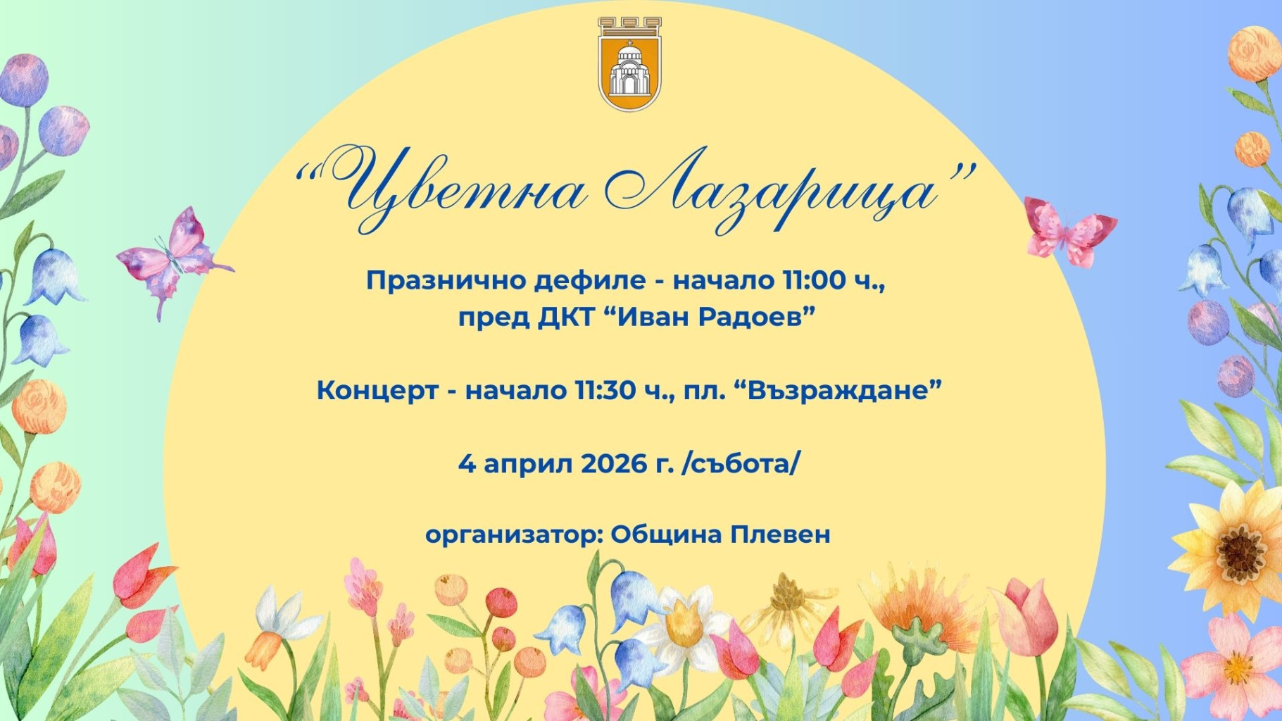 Плевен ще отбележи Лазаровден на 4 април (събота) 2026 г. с празнично детско дефиле и пролетен концерт под наслов „Цветна Лазарица”, съобщиха от Община Плевен.