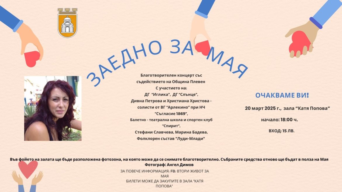 Благотворителен концерт под наслов „Заедно за Мая“ ще се проведе в Плевен на 20 март, в зала „Катя Попова“, с цел да се съберат средства за лечението на 38-годишната Мая Урукова. Мая, майка на две деца, страда от тежко автоимунно заболяване, миелит, което налага скъпо лечение в медицински център „Пирогов“ в Москва. За лечението ѝ е необходима трансплантация на хематопоетични стволови клетки, а необходимата сума от 50 000 евро е непосилна за семейството ѝ.