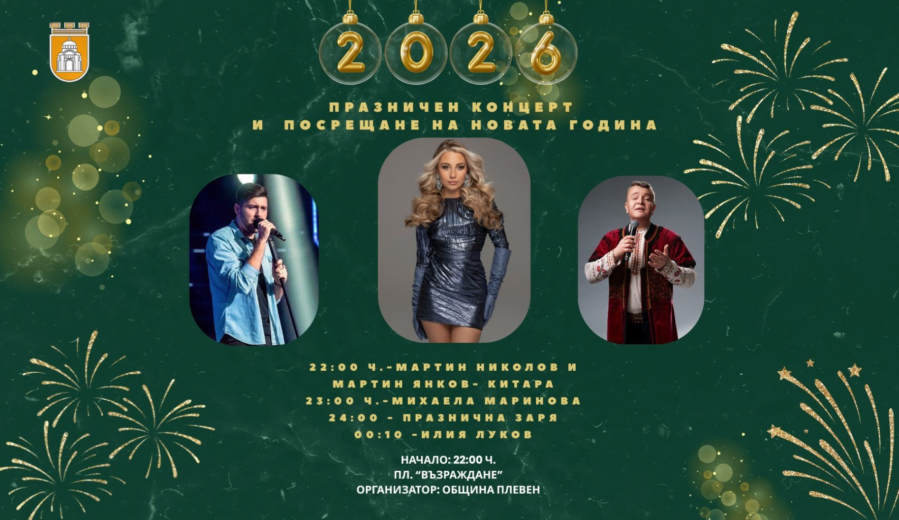 Плевен ще отбележи Новата 2026 година с грандиозен концерт, който ще включва изпълнения на популярната поп-звезда Михаела Маринова и народния певец Илия Луков. Събитието, организирано от Община Плевен, ще се състои на площад „Възраждане“ и ще започне в 22:00 часа. На сцената ще се присъединят и музикантите д-р Мартин Николов и китаристът Мартин Янков, а водещ на празничната вечер ще бъде актьорът Иван Жунтовски от плевенския Драматично-куклен театър.