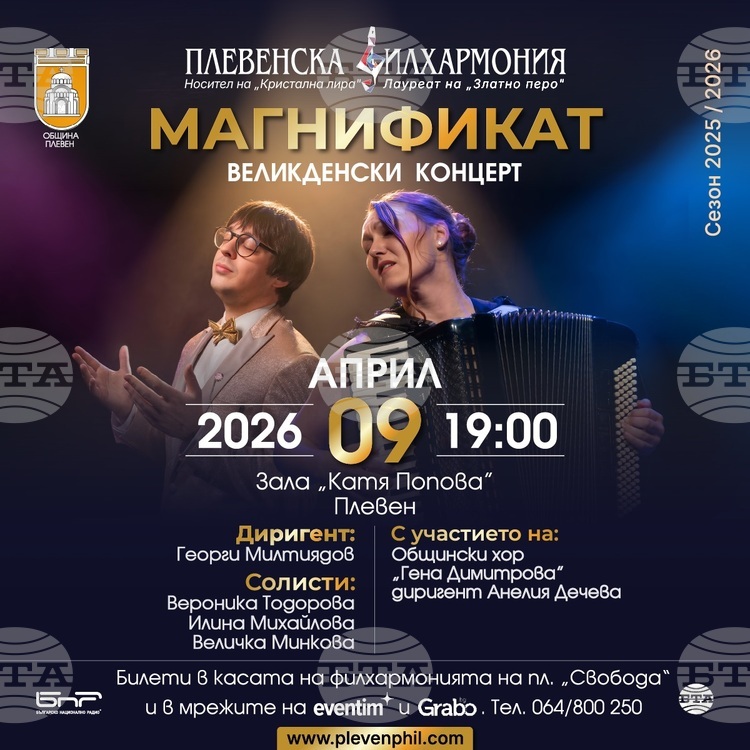 Великденският концерт „Магнификат“ е сред водещите акценти в априлската програма на Плевенската филхармония. На 21 април отново в зала „Катя Попова“ е планиран „Симфоничен концерт“ със солисти цигуларите Светлин Русев и Клое Русев. За детската публика е предвиден и проектът „Симфонична лаборатория“ – интерактивно музикално преживяване, посветено на ударните инструменти.