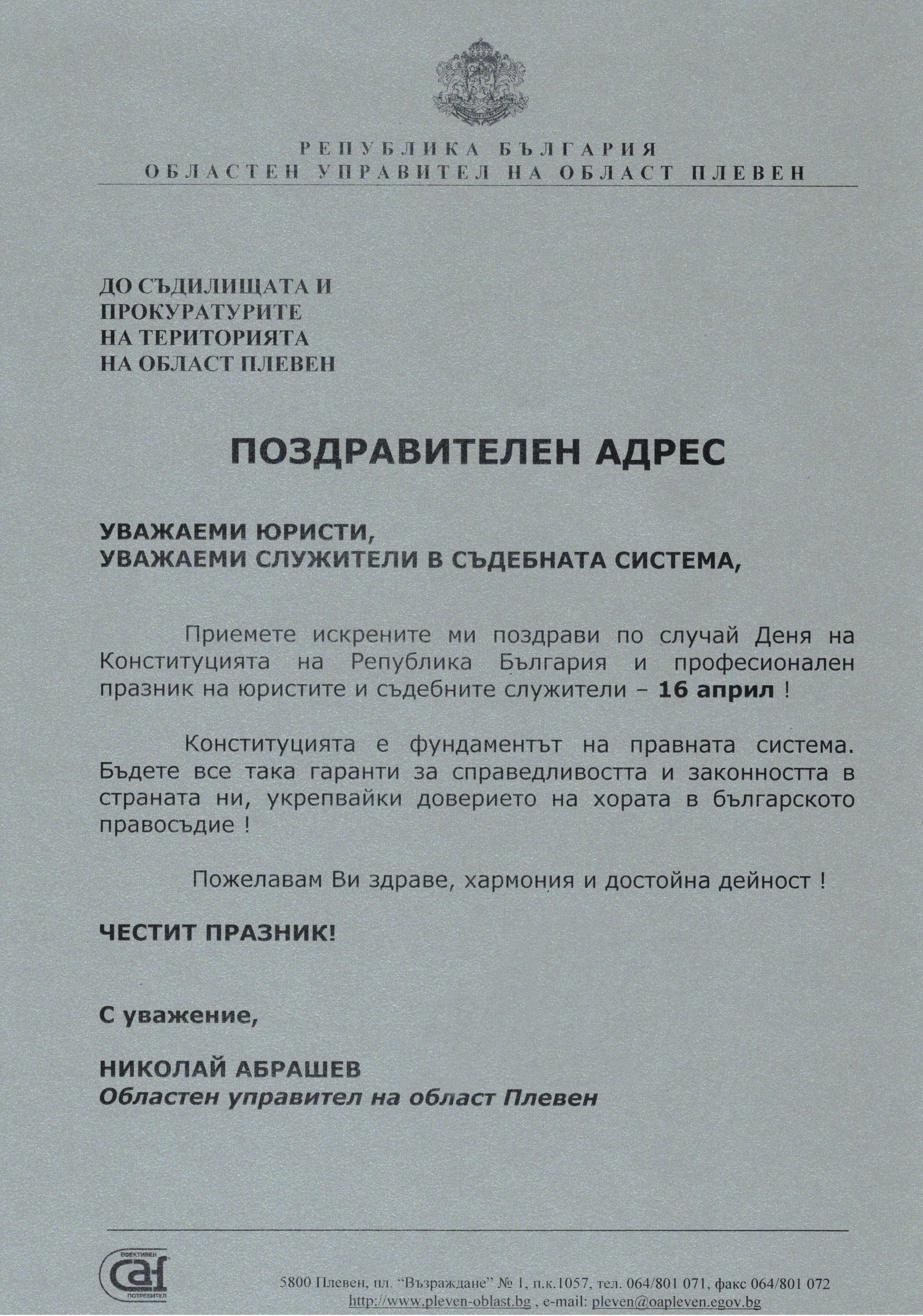 ПОЗДРАВИТЕЛЕН АДРЕС ПО ПОВОД 16 АПРИЛ-ДЕН НА БЪЛГАРСКАТА КОНСТИТУЦИЯ И ПРОФЕСИОНАЛЕН ПРАЗНИК НА ЮРИСТИТЕ В БЪЛГАРИЯ