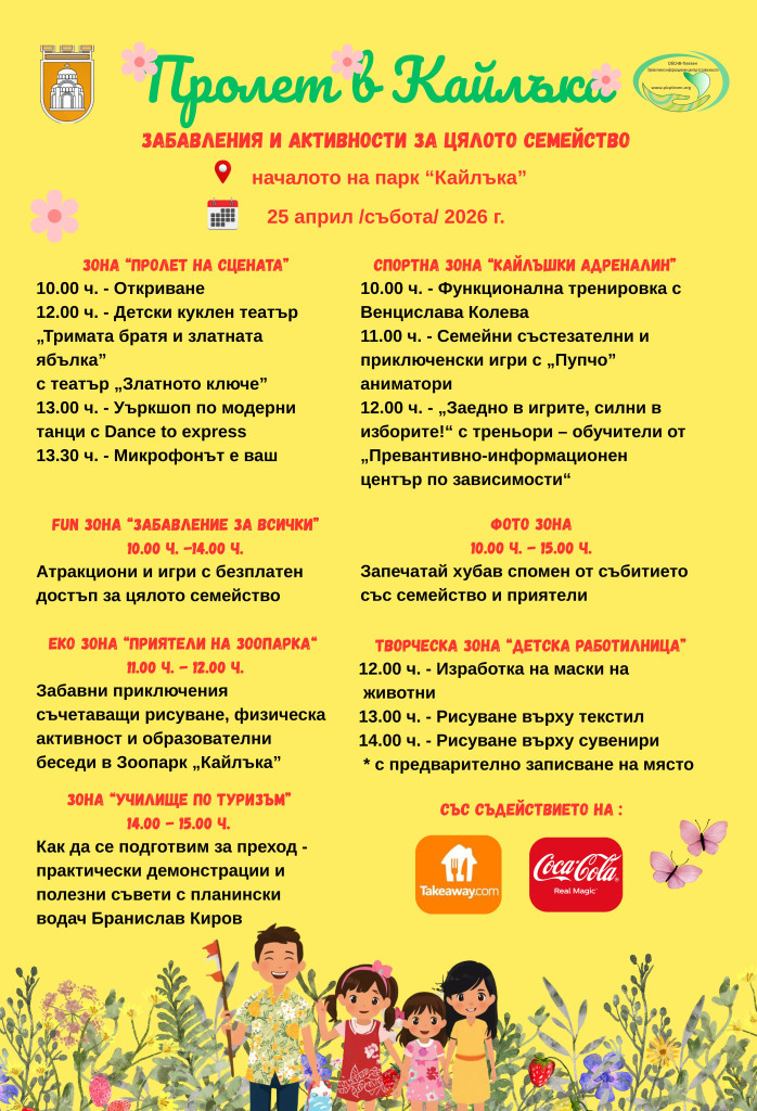 – 11.00 ч. – 12.00 ч. – „Забавни приключения, съчетаващи рисуване, физическа активност и образователни беседи в Зоопарк „Кайлъка”“