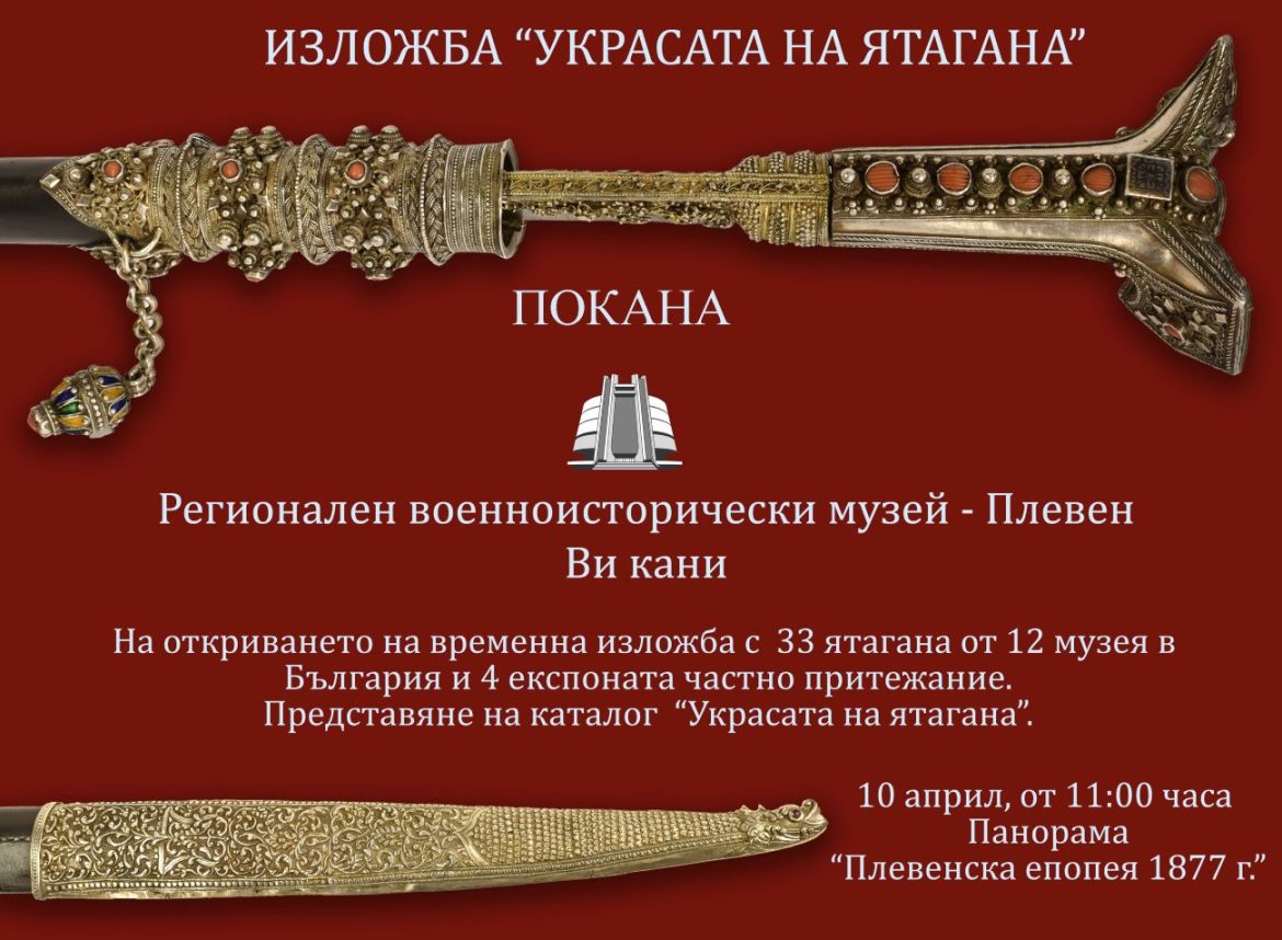 Временна изложба озаглавена „Украсата на ятагана“ ще бъде представена от Регионалния военноисторически музей – Плевен следващата седмица. Експозицията включва 33 ятагана с уникална украса и орнаментика, събрани от 12 музея в България, както и четири експоната, които са частно притежание. Тези движими културни ценности са съхранени от периода XVIII – XIX век. Наред с изложбата ще бъде представен и едноименен каталог, който е издание на Регионалния военноисторически музей – Плевен.