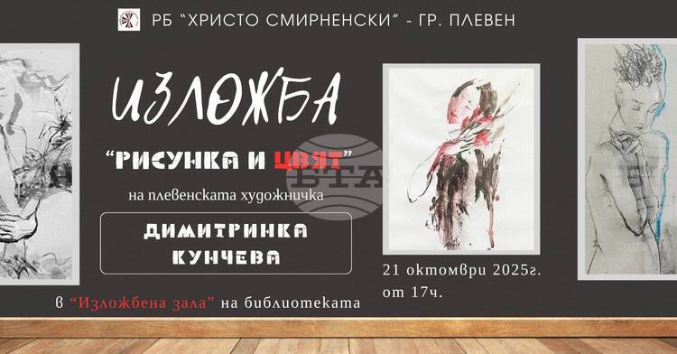 Регионална библиотека „Христо Смирненски“ в Плевен организира изложба, озаглавена „Рисунка и цвят“, която представя творчеството на местната художничка Димитринка Кунчева. Събитието ще бъде официално открито на 21 октомври, обявиха от библиотеката.