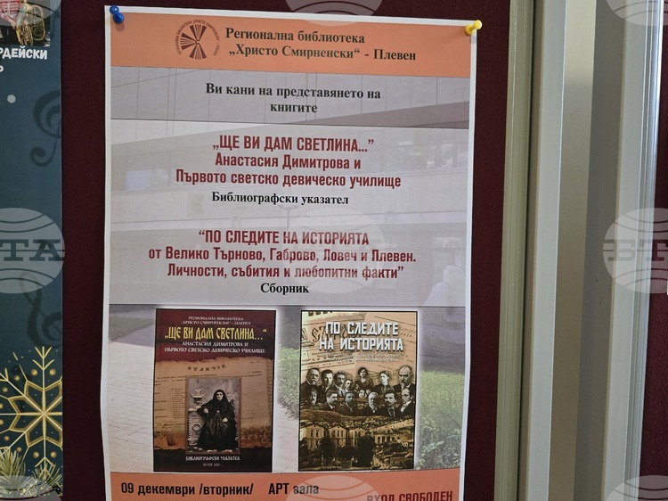 Регионалната библиотека „Христо Смирненски“ в Плевен е подготвила за представяне на 9 декември две нови издания: библиографския указател „Ще ви дам светлина… Анастасия Димитрова и Първото светско девическо училище“ и сборника „По следите на историята от Велико Търново, Габрово, Ловеч и Плевен. Личности, събития и любопитни факти“. Това съобщи Елвира Цветанова, ръководител на направление „Връзки с обществеността. Срещи и събития“ в културната институция.