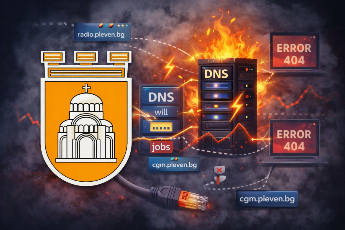 Промяна на DNS сървърите на официалния сайт на Община Плевен — pleven.bg — предизвика сериозни затруднения и временно прекъсване на редица административни и публични онлайн услуги. В резултат на промяната много от важните субдомейни на общината към момента не функционират коректно или изобщо не са достъпни.