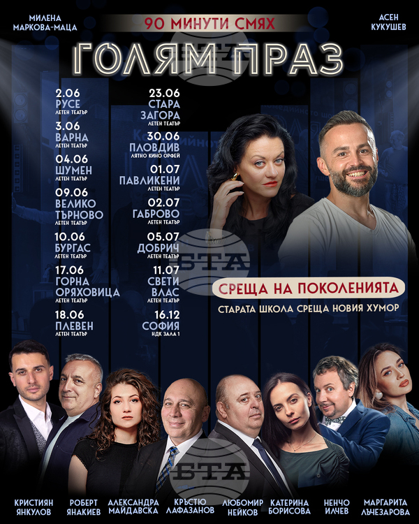 „Голям праз“ започва национално турне с общо 16 дати в страната, съобщават от Art Label Production. Първата спирка е в Русе на 2 юни, след което спектакълът ще гостува във Варна (3 юни) и Шумен (4 юни). През юни са планирани още представления във Велико Търново (9 юни) и Бургас (10 юни), а маршрутът продължава през Горна Оряховица (17 юни), Плевен (18 юни), Стара Загора (23 юни) и Пловдив (30 юни). В началото на юли турнето включва Павликени (1 юли), Габрово (2 юли), Добрич (5 юли) и Свети Влас (11 юли). Предвидени са и есенни дати – в Хасково на 15 октомври и Пазарджик на 12 ноември, а финалното представление ще бъде на 16 декември в зала 1 на НДК.