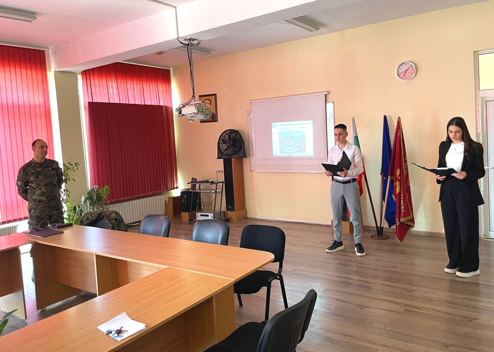 В рамките на програмата в училището гостува подполковник Симеон Борисов – ПР на Сухопътните войски на Българската армия. Той представи пред учениците дейността и структурата на Командването на Сухопътните войски, като акцентира върху ролята им в съвременната система за отбрана.